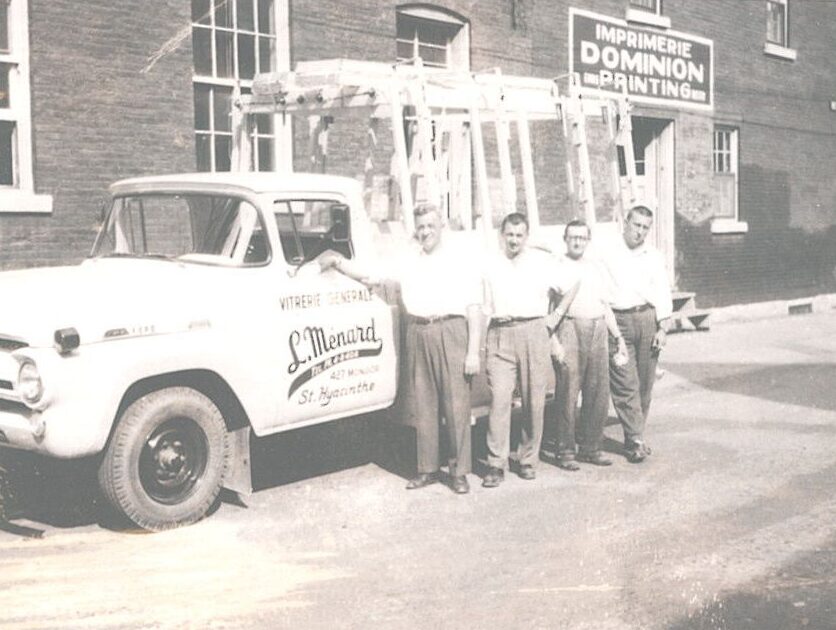 C’est en 1949 que Lucien Ménard fonde la vitrerie L. Ménard & Fils, sur la rue Mondor à Saint-Hyacinthe. À cette époque, les vitrines commerciales se composaient de grandes vitres simples, tandis que les maisons étaient équipées des fameux châssis de bois, patiemment calfeutrés au mastic. Avec son savoir-faire et sa détermination, Lucien décroche rapidement d’importants contrats industriels, comme la fourniture des 2 000 vitres de l’usine Goodyear et celles de la Penmans.